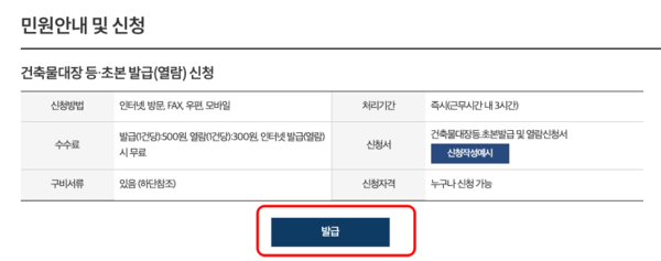 건축물대장 등초본 발급 신청화면이 표시되면 하단의 발급 버튼을 선택합니다. 이 문서는 신청하는 즉시 발급이 된다는 점도 기억하시기 바랍니다.