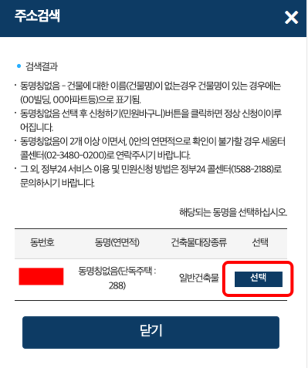 건축물대장 등초본 발급(열람) 신청 화면이 표시되면 건축물소재지의 주소 검색 버튼을 선택하여 주소 검색창에서 동을 선택합니다. 이후 대장 구분 및 대장 종류를 선택합니다. 수령방법에서 온라인 발급 (본인 출력)을 선택합니다.