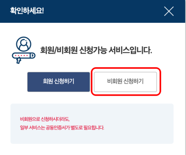 이후 회원 신청 또는 비회원 신청 화면이 표시됩니다. 회원이 아니여도 공동 인증서 인증을 통해 열람 및 발급이 가능하니 비회원을 선택해 보겠습니다.