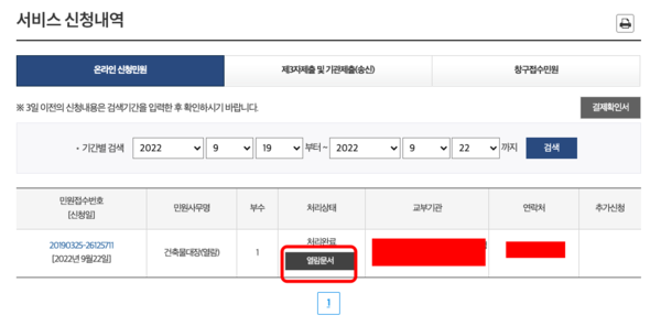 끝으로 하단에서 민원신청하기를 선택하면 건축물대장 인터넷발급이 완료됩니다. 정부 24 홈페이지에서 My GOV 나의 서비스 > 서비스 신청내역을 확인하시면 신청한 건축물대장의 처리상태와 교부 기관, 연락처 등을 확인할 수 있습니다. 열람 문서를 선택해보겠습니다.