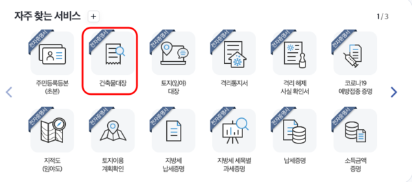 정부24 홈페이지로 이동하면 첫 화면 본문에서 자주찾는 서비스를 발견할 수 있습니다. 여러 가지 민원서류 중 건축물대장을 클릭합니다.