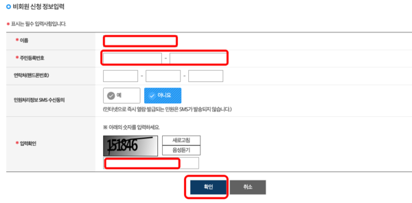 개인정보 수집 및 고유식별정보 수집 이용 동의에 동의 표시를 하시고 고유 식별정보 수집에 대한 안내를 확인하고 동의를 합니다. 이후 비회원 신청 정보를 입력하고 입력 확인 숫자를 입력한 후 확인을 클릭합니다.