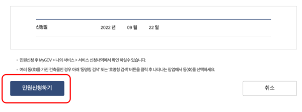 끝으로 하단에서 민원신청하기를 선택하면 건축물대장 인터넷발급이 완료됩니다. 정부 24 홈페이지에서 My GOV 나의 서비스 > 서비스 신청내역을 확인하시면 신청한 건축물대장의 처리상태와 교부 기관, 연락처 등을 확인할 수 있습니다. 열람 문서를 선택해보겠습니다.