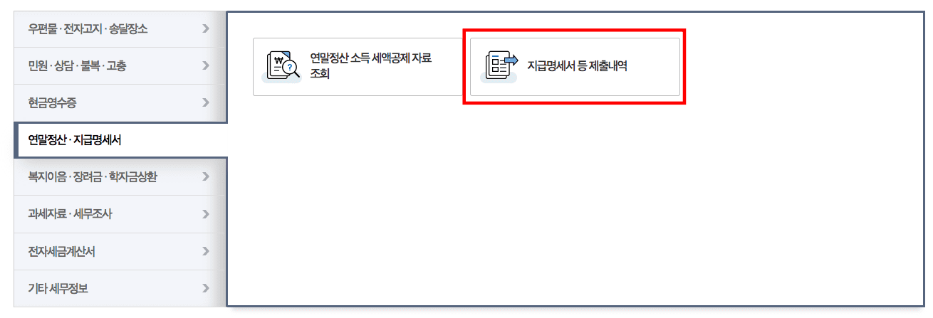 My홈택스 메뉴가 표시되면 좌측 하단에서 연말정산 지급명세서 메뉴를 선택합니다. 이후 우측 세부 항목에서 지급명세서 등 제출내역을 선택합니다.