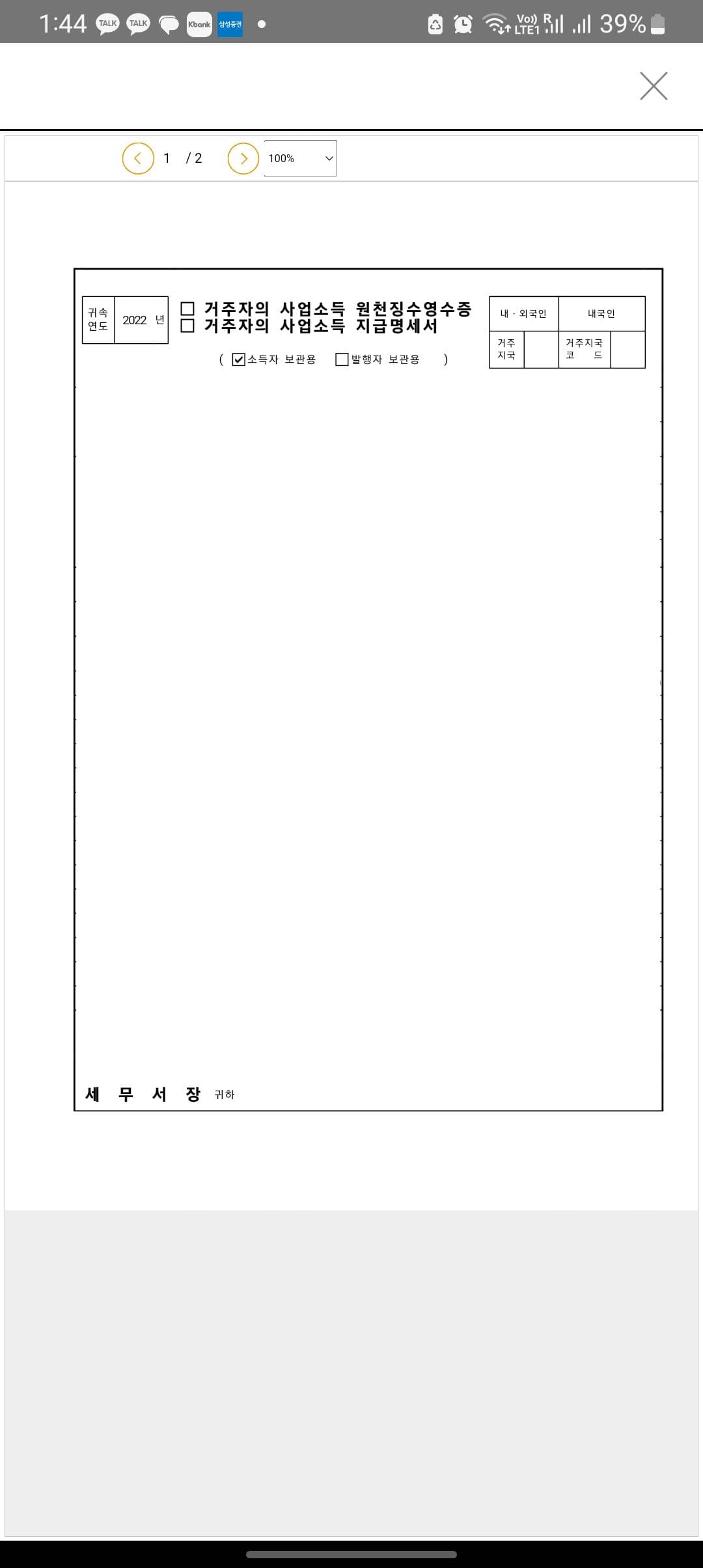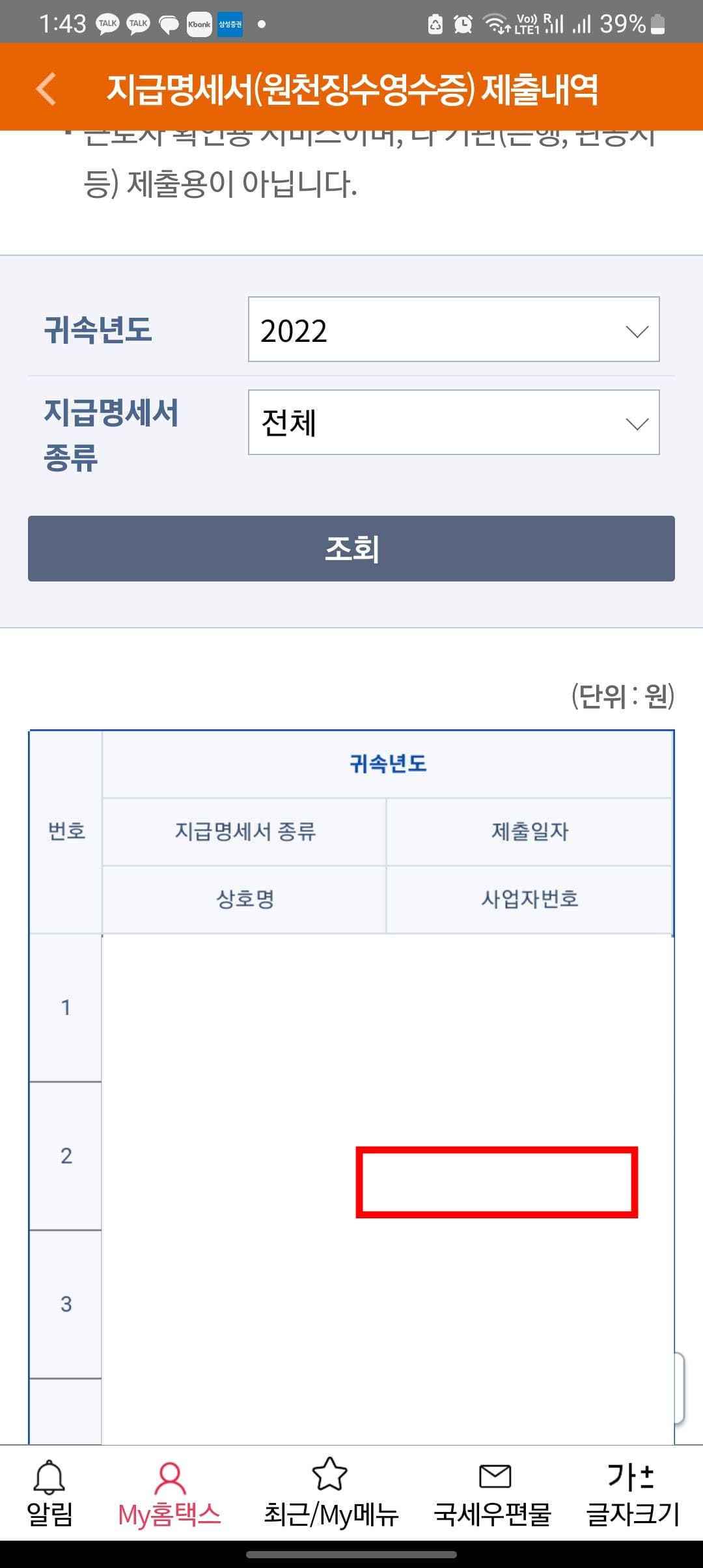 귀속 연도를 선택하고 조회버튼을 터치하면 지급명세서 항목이 표시됩니다. 사업자번호를 터치하면 근로소득원천징수영수증을 확인할 수 있습니다. 따로 프린트 기능은 지원되지 않기 때문에 화면캡처로 사진으로 저장하셔서 프린트로 출력하시면 됩니다.