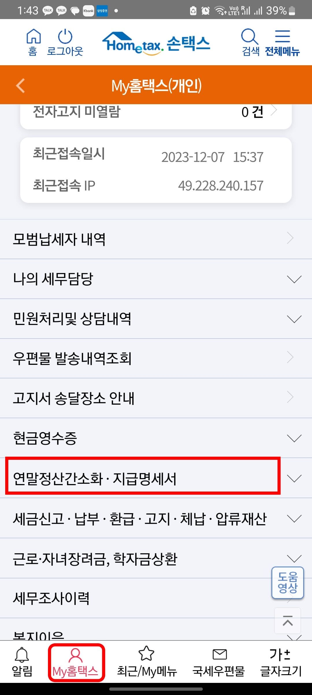 로그인이 되었으면 하단의 [My홈택스] 메뉴를 선택합니다. 이후 연말정산간소화 지급명세서 메뉴를 터치합니다. 세부 메뉴가 표시되면 지급명세서 (원천징수영수증) 조회를 선택합니다.