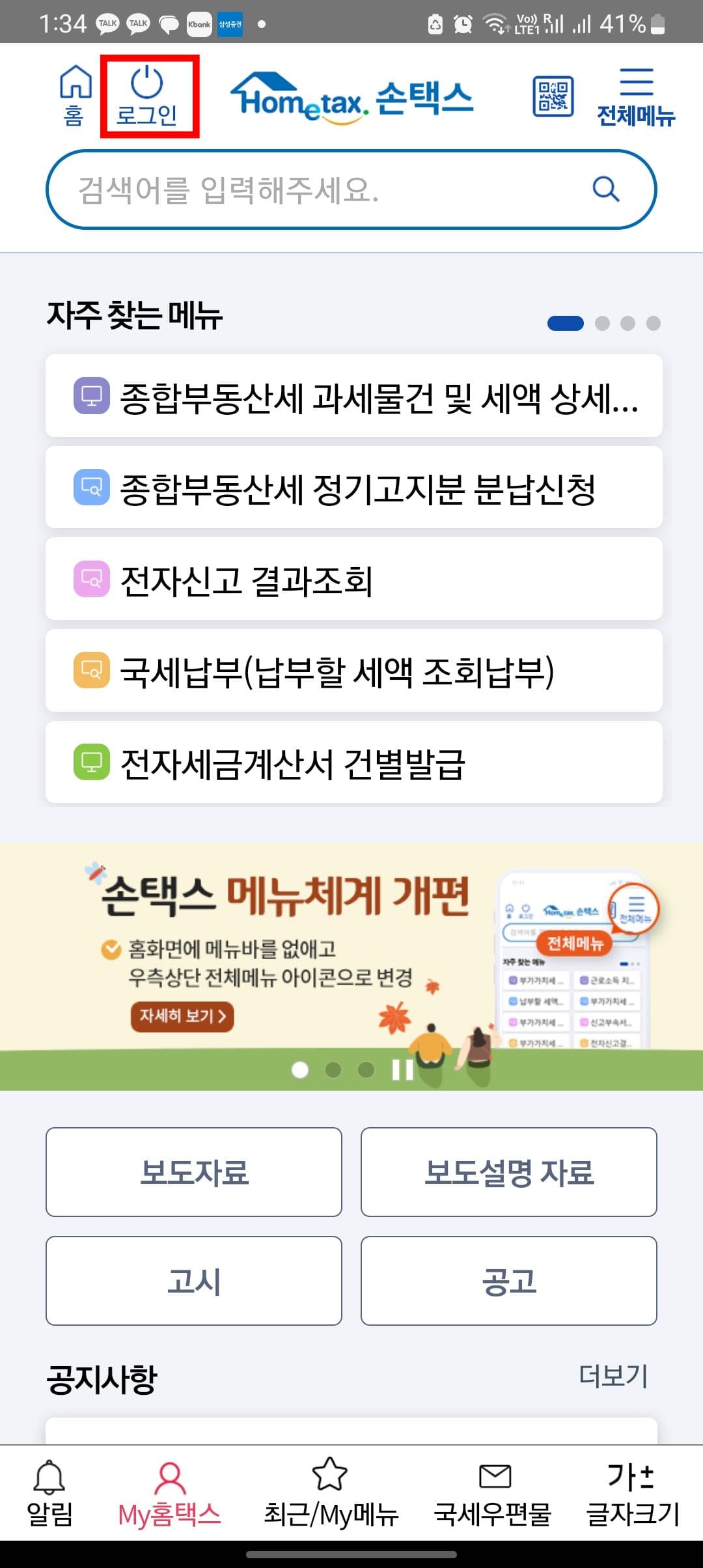 국세청 홈택스 홈페이지에 도착하시면 위와 같은 메인화면을 확인할 수 있습니다. 우측 상단의 My홈택스 메뉴를 클릭합니다.