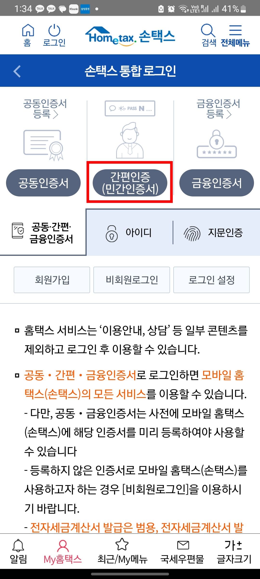 손택스 앱을 실행하시면 위와 같은 화면을 볼 수 있습니다. 좌측 상단의 로그인 메뉴를 터치합니다. 이후 로그인 화면에서 원하는 인증 수단을 선택합니다. 간편 인증을 선택하면 보유한 민간인증서를 선택하고 휴대폰 인증을 완료합니다.