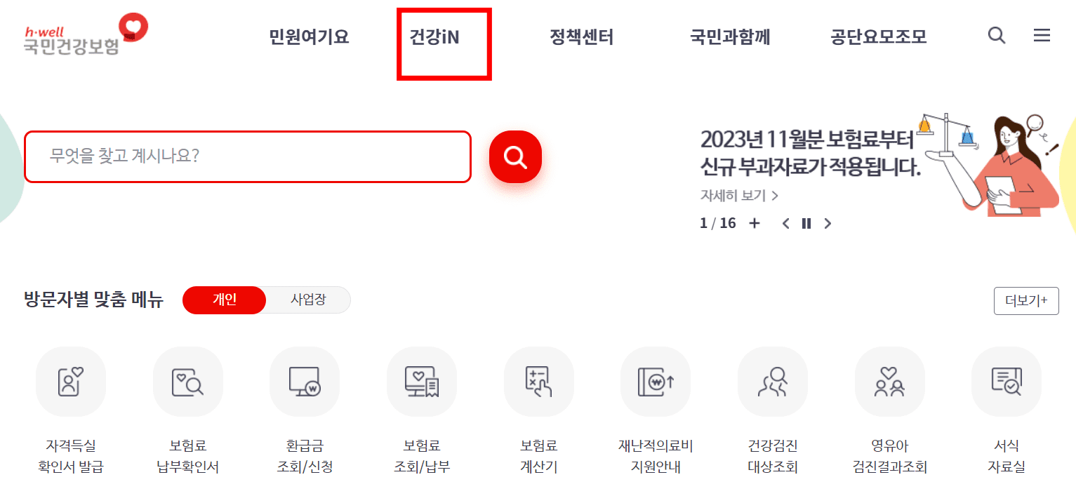 국민건강보험 홈페이지에 방문하시면 위의 사진과 같은 메인화면을 볼 수 있습니다. 상단 메뉴 건강iN에 마우스를 가져갑니다. 이후 아래 세부 메뉴에서 검진기관/병원찾기 메뉴를 클릭합니다.