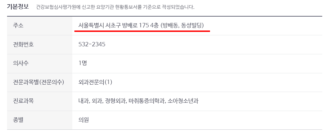 검색결과를 확인하시면 다양한 의료기관이 검색되는 것을 확인할 수 있습니다. 원하는 의료기관의 상세 버튼을 클릭합니다. 기본정보에서 해당 의료기관의 주소와 전화번호를 확인할 수 있습니다. 또한 지도 메뉴에서 길 찾기 버튼을 클릭하면 카카오맵으로 연결되어 현 위치에서 의료기관까지의 길을 자세히 안내받을 수 있으니 확인해 보시기 바랍니다.