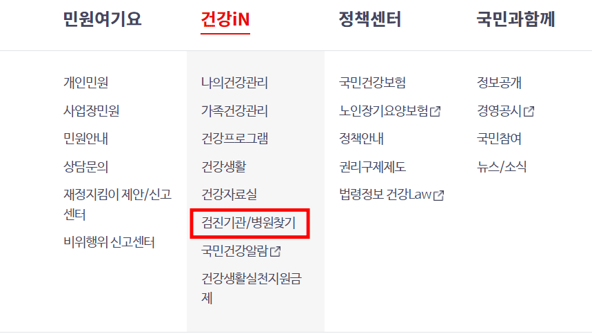 국민건강보험 홈페이지에 방문하시면 위의 사진과 같은 메인화면을 볼 수 있습니다. 상단 메뉴 건강iN에 마우스를 가져갑니다. 이후 아래 세부 메뉴에서 검진기관/병원찾기 메뉴를 클릭합니다.