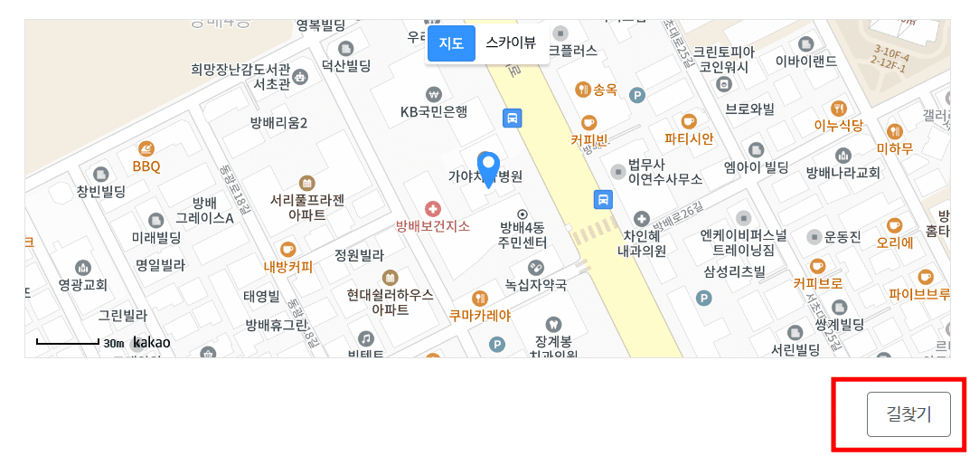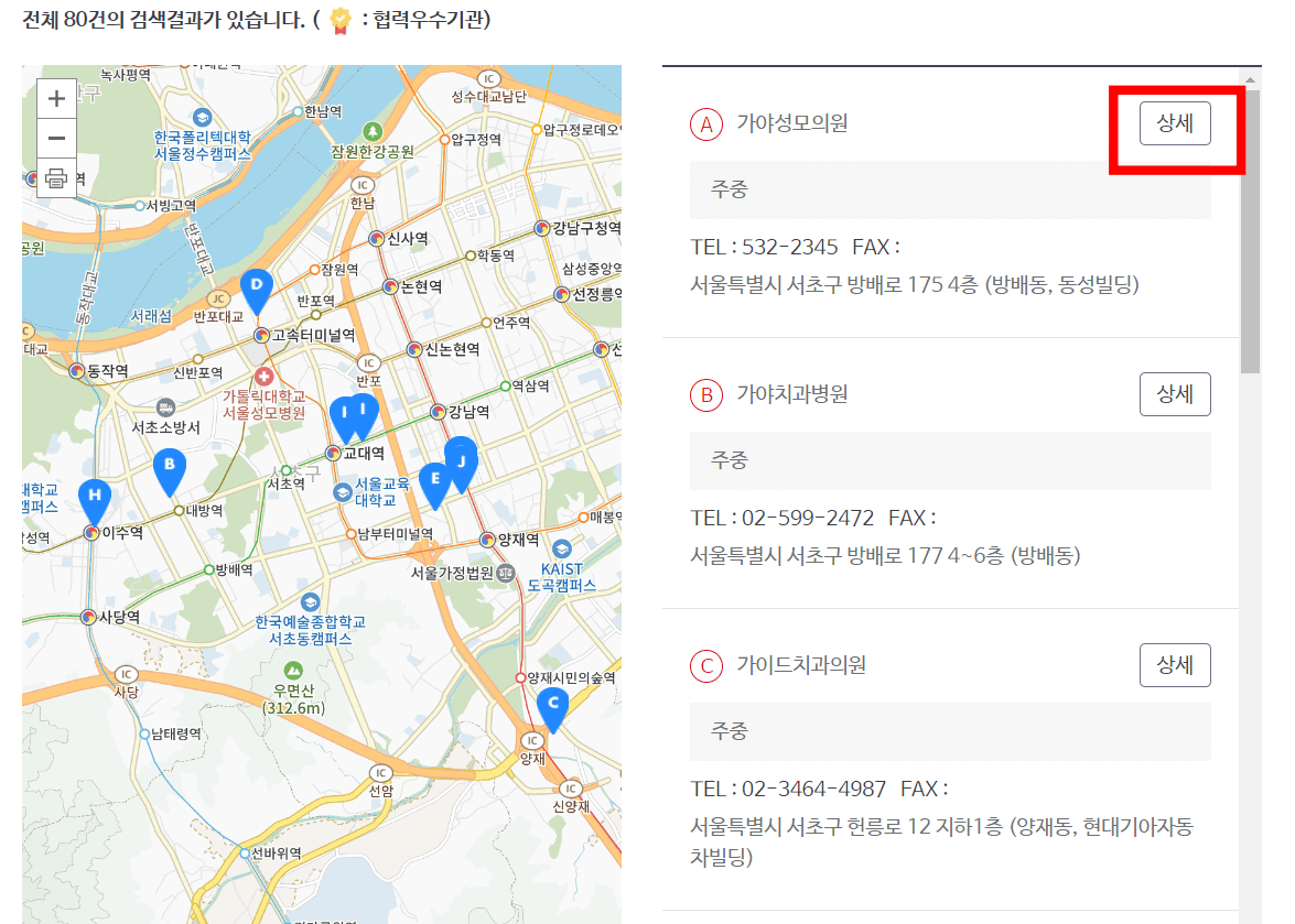 검색결과를 확인하시면 다양한 의료기관이 검색되는 것을 확인할 수 있습니다. 원하는 의료기관의 상세 버튼을 클릭합니다. 기본정보에서 해당 의료기관의 주소와 전화번호를 확인할 수 있습니다. 또한 지도 메뉴에서 길 찾기 버튼을 클릭하면 카카오맵으로 연결되어 현 위치에서 의료기관까지의 길을 자세히 안내받을 수 있으니 확인해 보시기 바랍니다.