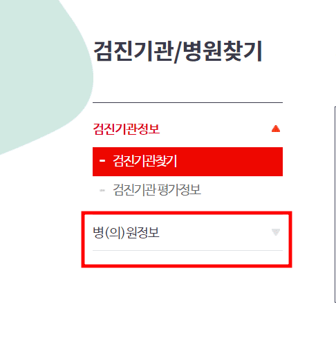 검진기관/병원찾기 페이지가 표시되면 좌측메뉴에서 [병(의)원정보]를 선택합니다. 하단 상세 메뉴에서 금연치료 의료기관 찾기를 클릭합니다.