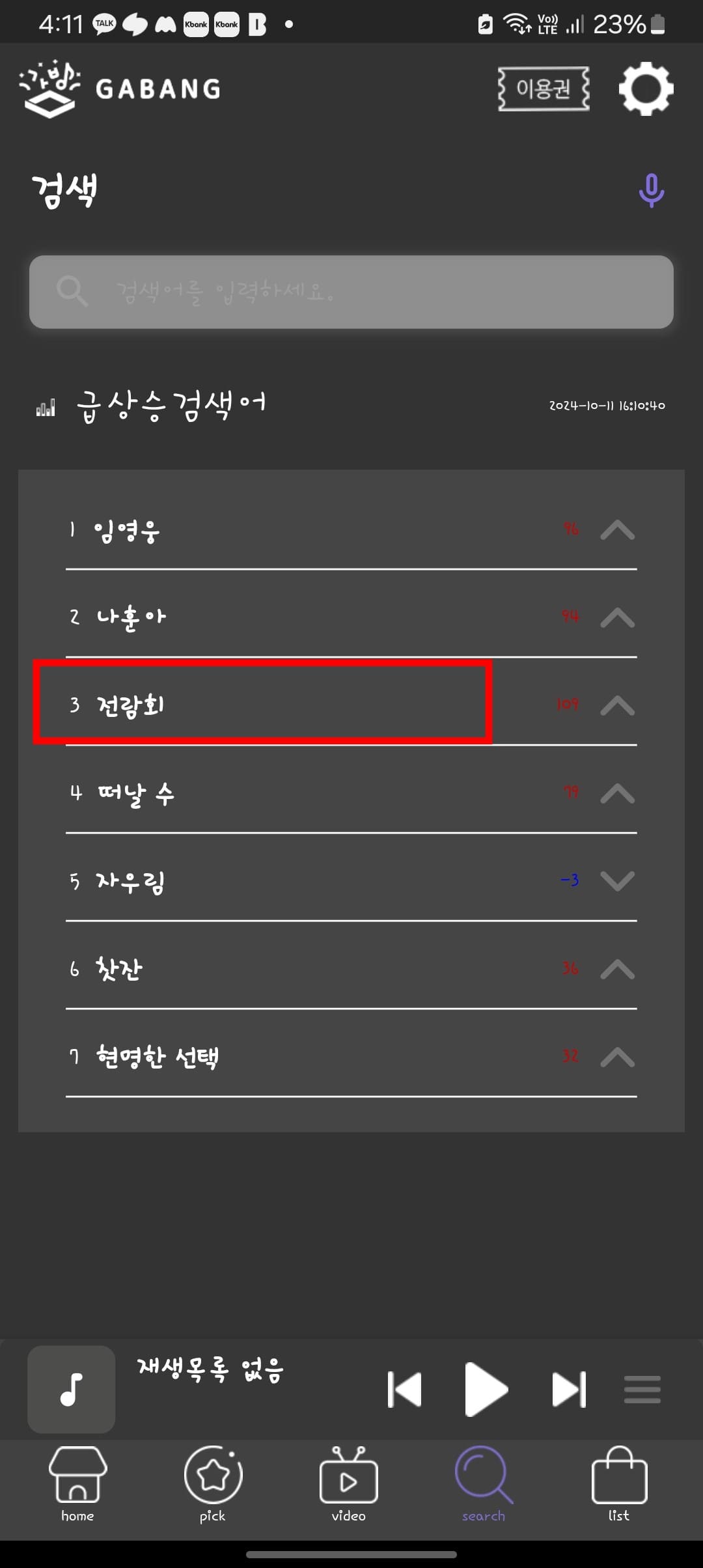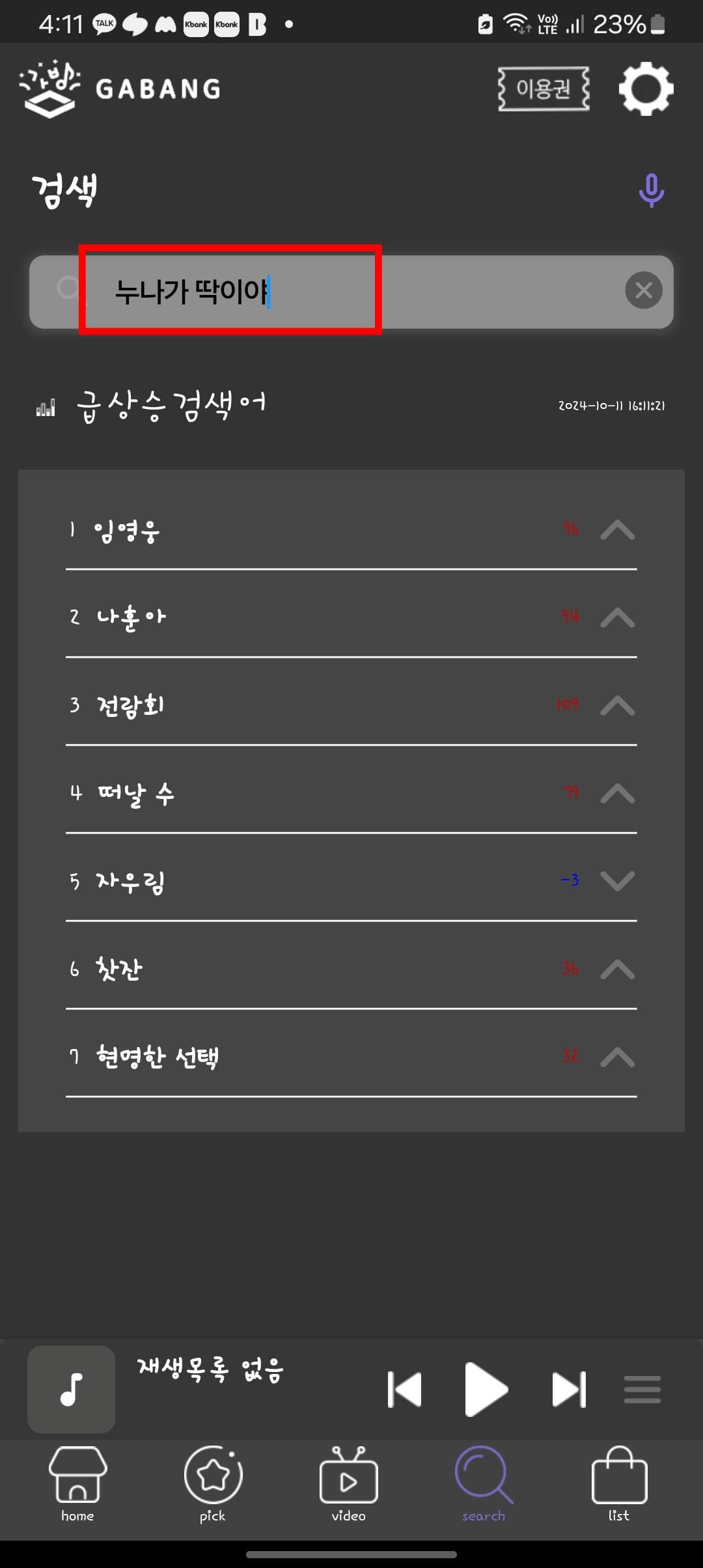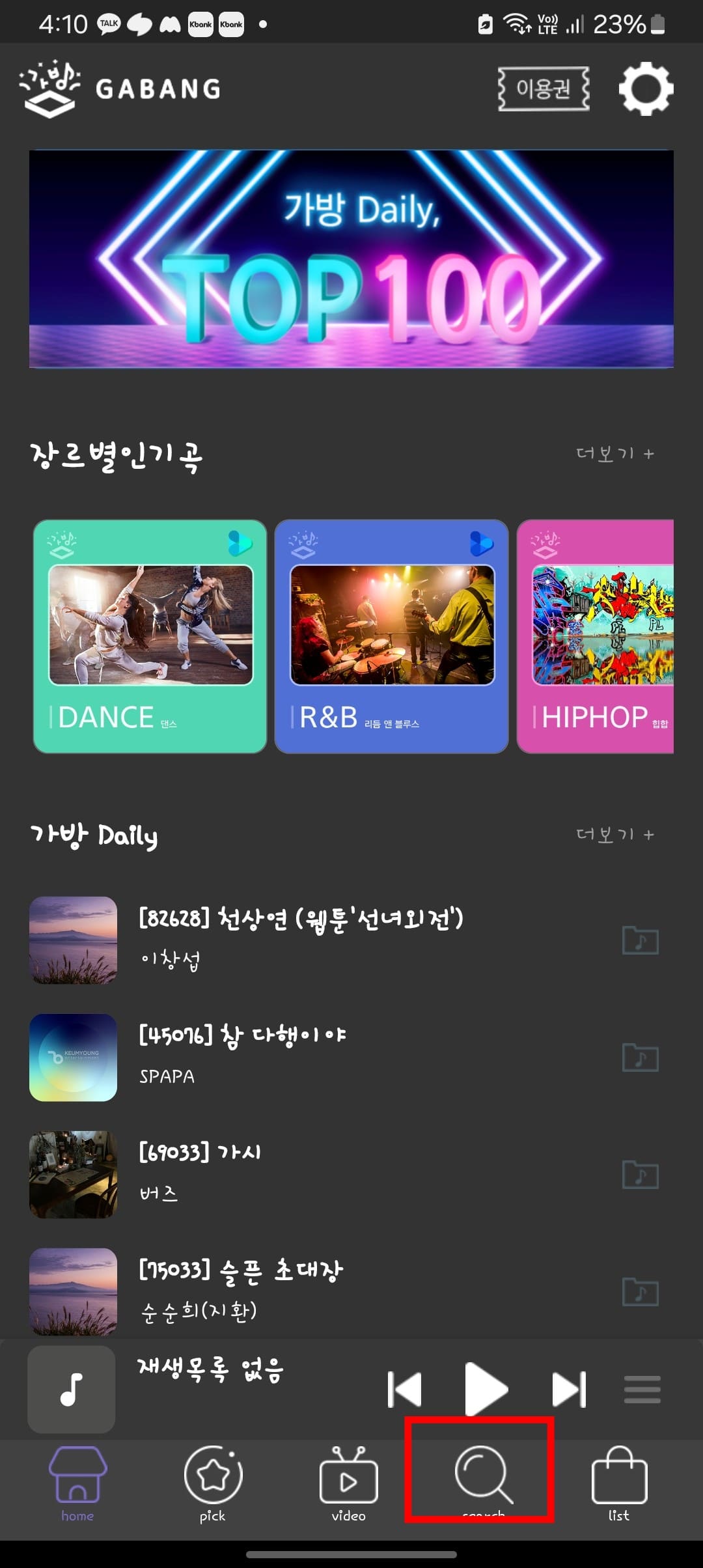 가방 앱을 설치하고 실행하면 위와 같은 메인 화면을 볼 수 있습니다. 하단에서 돋보기 메뉴를 터치합니다. 검색 페이지가 보이면 급상승 검색어를 클릭하거나 입력창에 직접 가수명이나 곡명을 입력하여 검색할 수 있습니다.