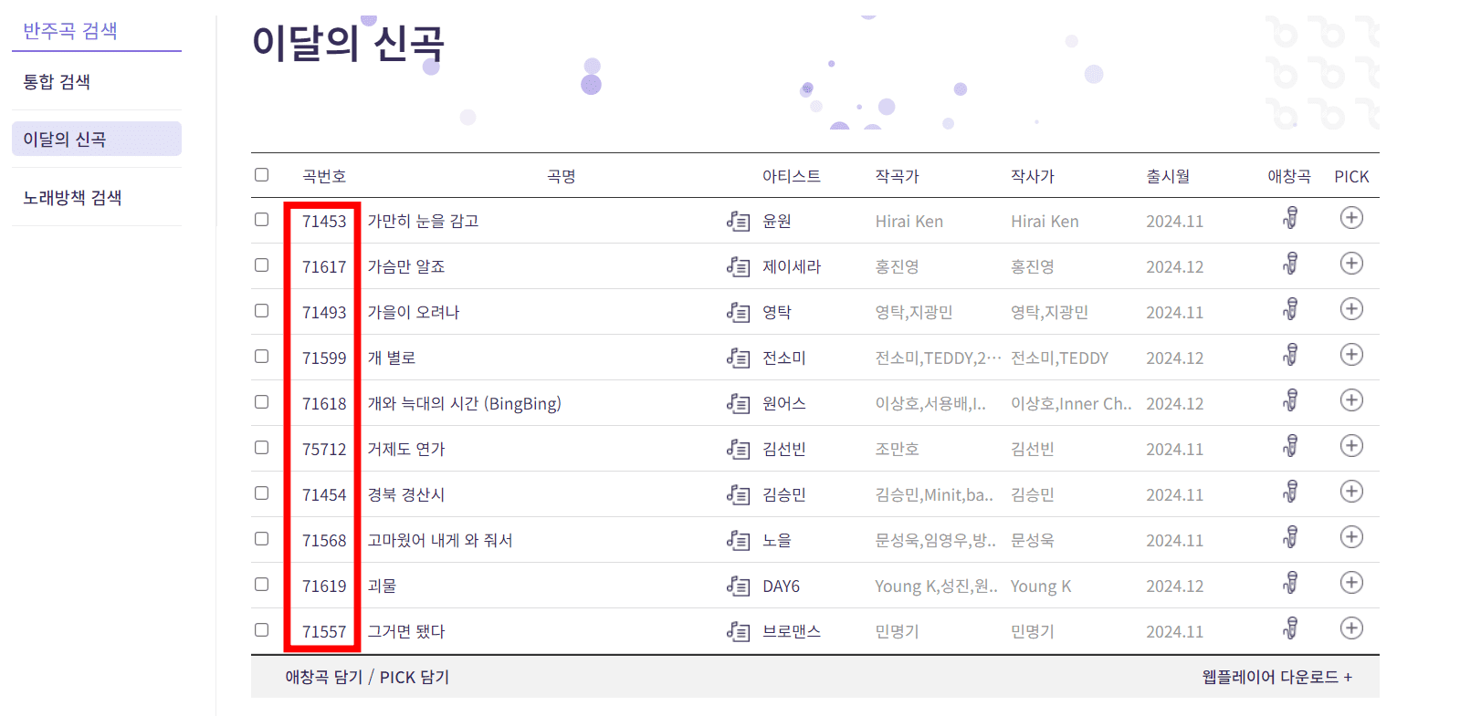 이달의 신곡 페이지를 확인하시면 요즘 뜨는 노래나 최신곡이 업데이트되는 것을 확인할 수 있습니다. 제일 처음에 곡번호가 표시되므로 원하는 곡의 곡번호를 따로 적어두거나 외우면 됩니다.