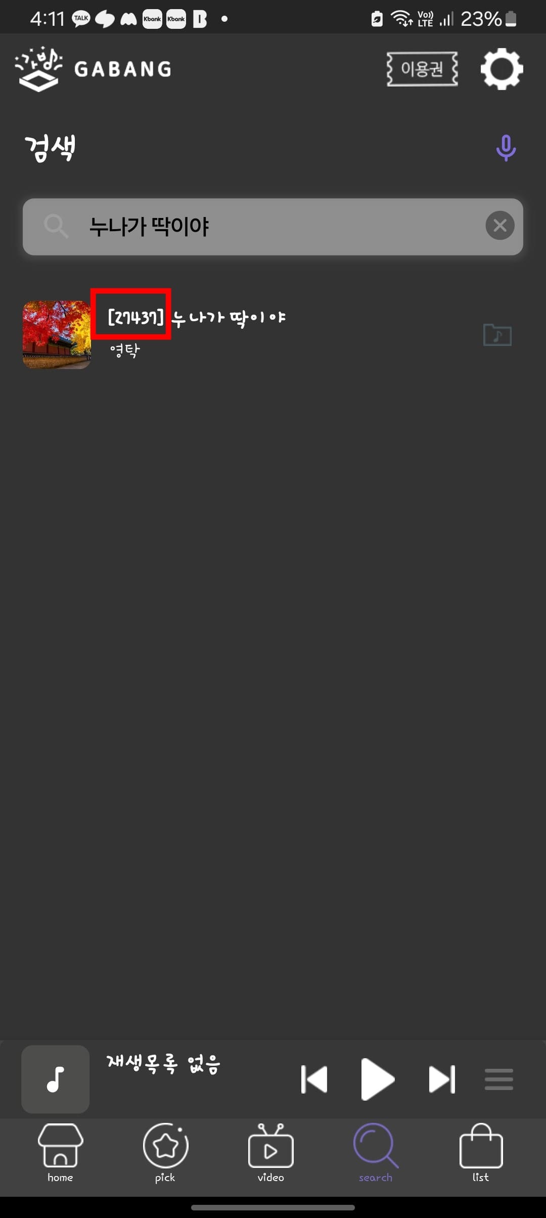 곡이름을 알고 있는 경우라면 검색창에 노래제목을 입력하고 검색합니다. 영탁 님의 누나가 딱이야의 곡번호는 [27437]인 것을 확인할 수 있었습니다.