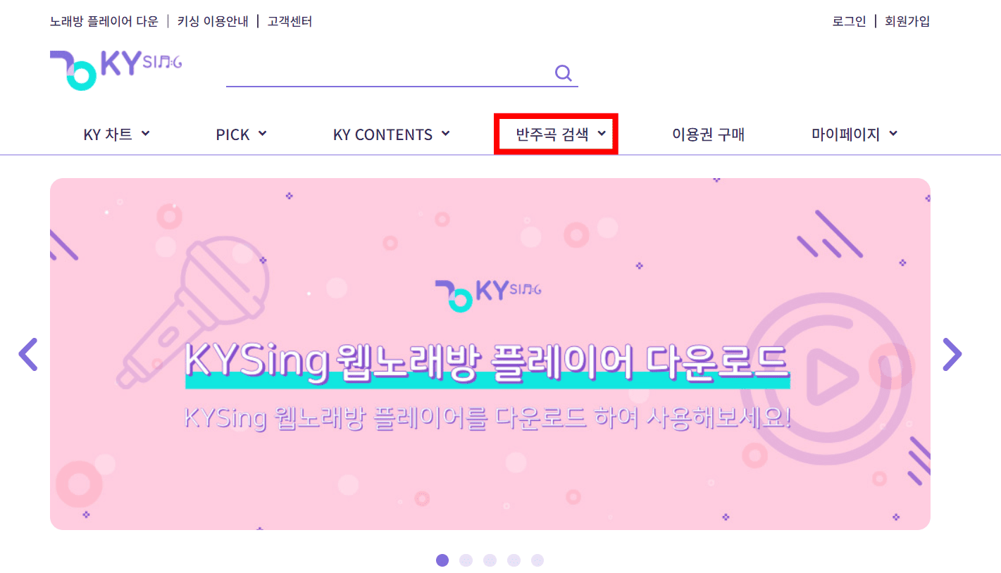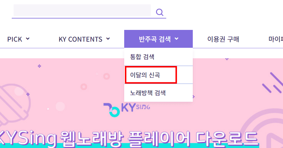 키싱 홈페이지에 방문하시면 위와 같은 메인 페이지를 확인할 수 있습니다. 상단 메뉴의 [반주곡 검색]으로 마우스를 가져갑니다. 최신 가요를 좋아하시는 분이라면 이달의 신곡을 선택해 보시기 바랍니다.