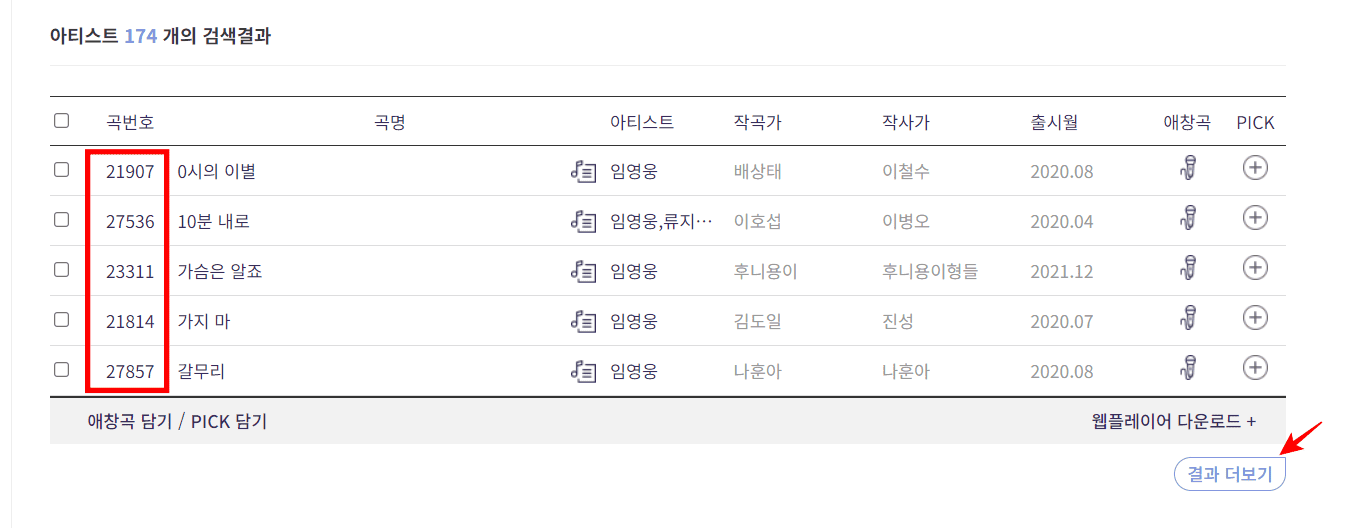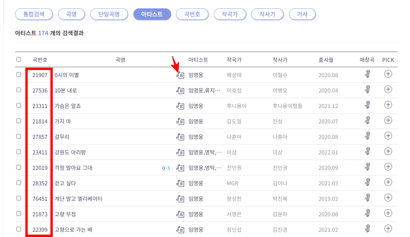 임영웅 씨가 부른 174개의 곡이 표시되며 곡번호 역시 확인이 가능합니다. 아티스트 이름 앞의 가사 아이콘을 클릭하면 해당 곡의 가사도 확인이 가능하니 금영노래방 노래찾기와 함께 직접 시도해 보시기 바랍니다.