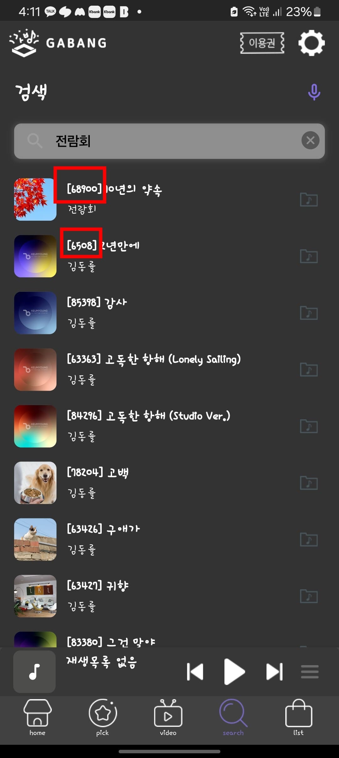 전람회를 클릭해 보니 김동률 님이 부른 다양한 곡들의 곡번호를 확인할 수 있었습니다.