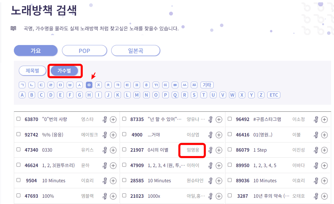 가수별 검색으로 'o'을 선택하였더니 해당 자음으로 시작하는 다양한 가수들과 곡이 표시되는 것을 확인할 수 있습니다. 요즘 제가 즐겨 듣는 임영웅 씨의 곡도 보입니다.