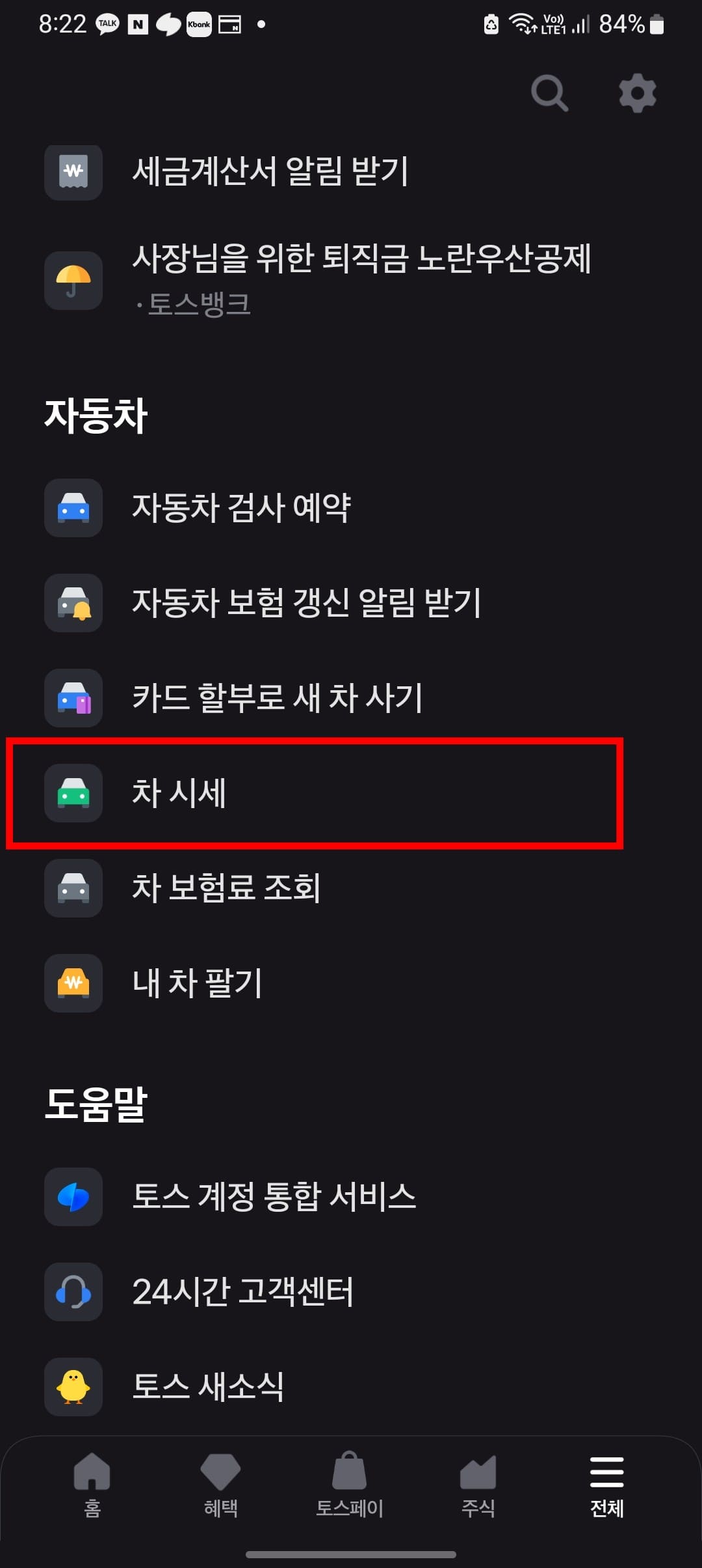 토스 앱을 실행하고 하단 메뉴에서 전체를 선택합니다. 이후 전체 메뉴에서 스크롤을 내리면 자동차 > 차 시세 메뉴를 터치합니다. '내 차 번호로 시세 보기'를 선택하면 차량번호를 입력하고 하단의 확인 버튼을 터치합니다. 토스 차 시세를 확인하면 출고가격, 차량등록일, 현재 시세, 1년 뒤 시세 등 다양한 정보를 확인할 수 있습니다.