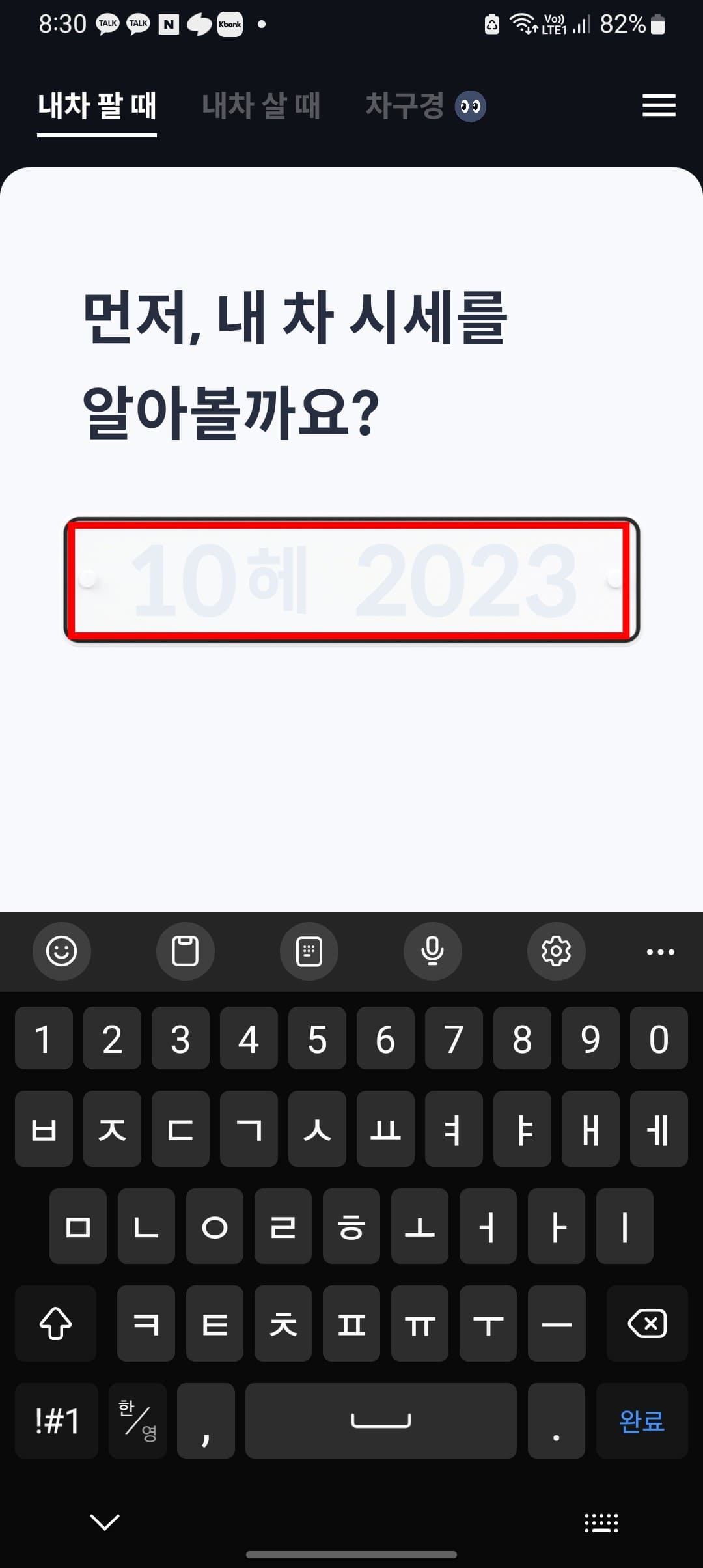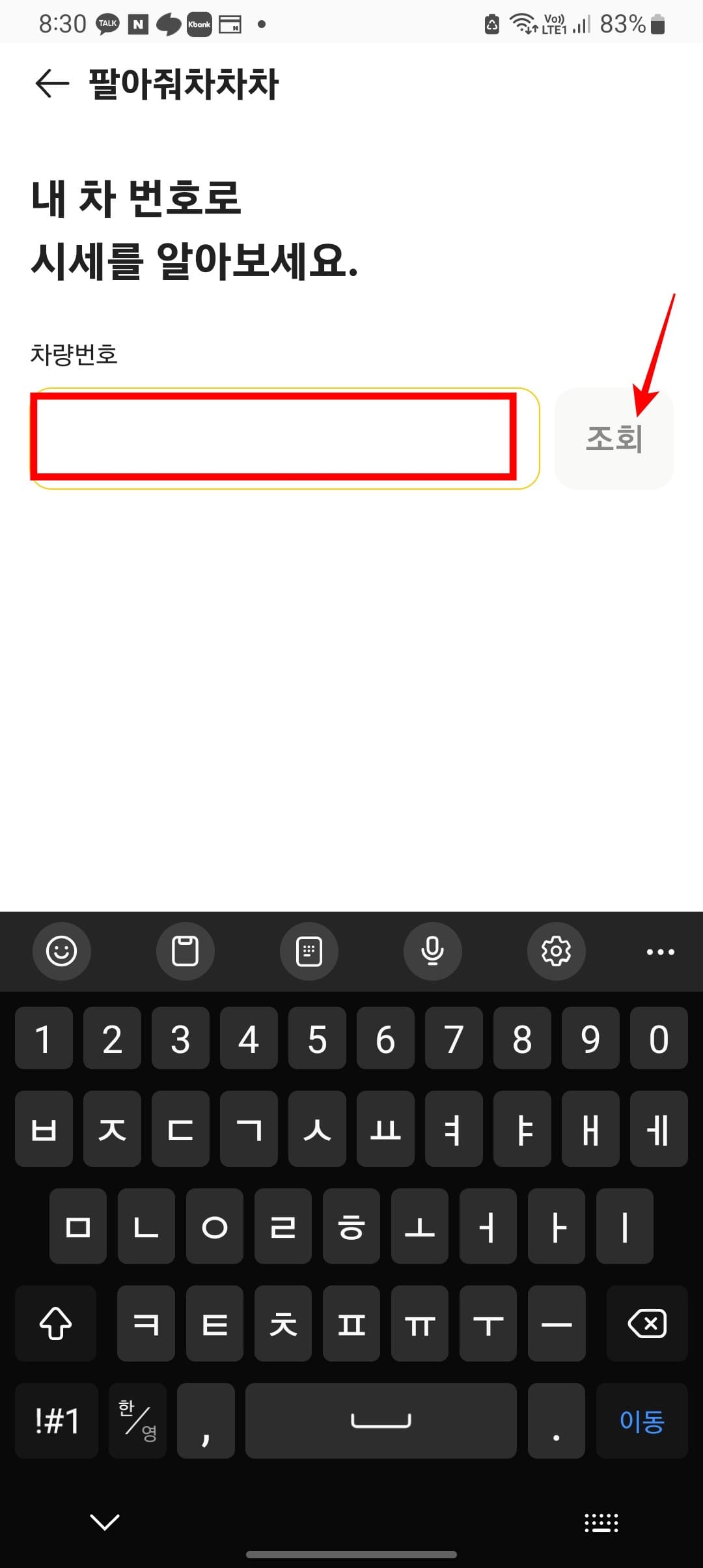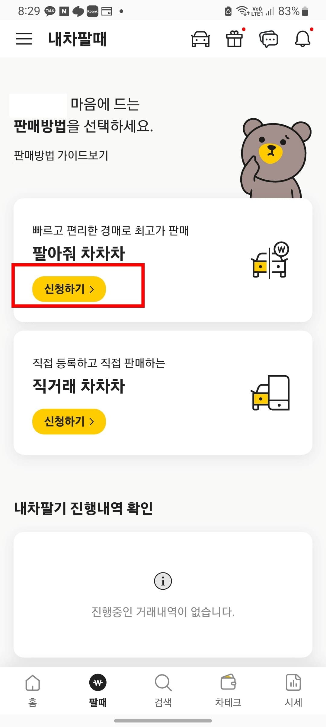 KB차차차 앱을 실행하면 위와 같은 화면을 볼 수 있습니다. 하단의 팔때 메뉴를 터치합니다. 내 차 팔 때 메뉴에서 팔아줘 차차차 하단의 신청하기 버튼을 터치합니다. 입력란에 표시되면 차량번호를 입력하고 우측 조회 버튼을 터치합니다. KB차차차는 중고차 매물대수 1위 플랫폼으로 간편한 시세조회를 통해 매물등록을 할 수 있으니 활용해 보시기 바랍니다.