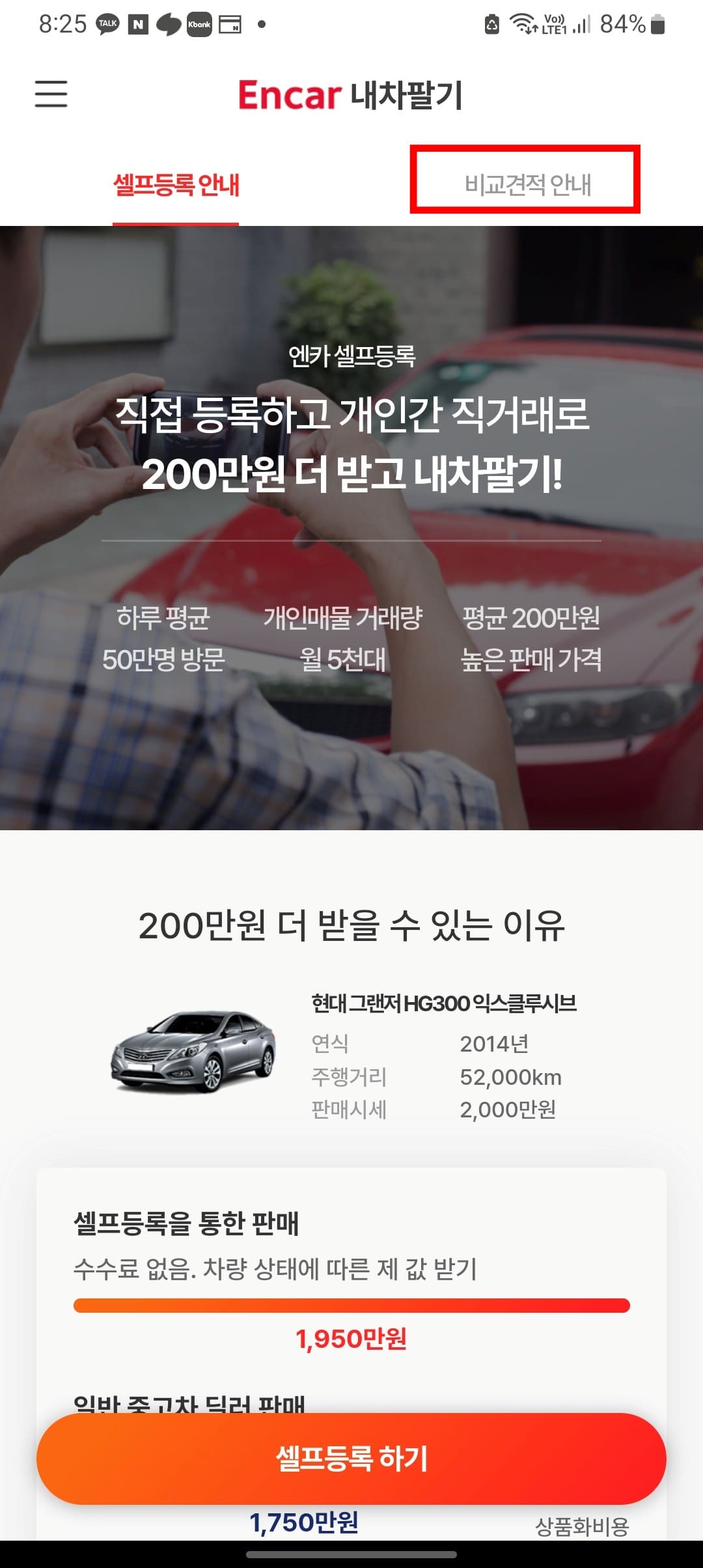 SK엔카 어플을 실행하면 위와 같은 화면을 볼 수 있습니다. 카카오로 3초 만에 시작 버튼을 터치합니다. 동의표시를 하고 확인을 터치하면 회원가입이 완료되었다는 메시지가 표시됩니다. 하단에서 계속하기 버튼을 터치합니다. 메인 화면에서 내 차 팔기 > 셀프등록 메뉴를 터치합니다. 상단에서 비교견적 안내 메뉴를 선택합니다. 비교견적 입력란에 차량 번호를 입력하시고 우측의 조회버튼을 터치하면 간단하게 시세조회가 가능합니다.