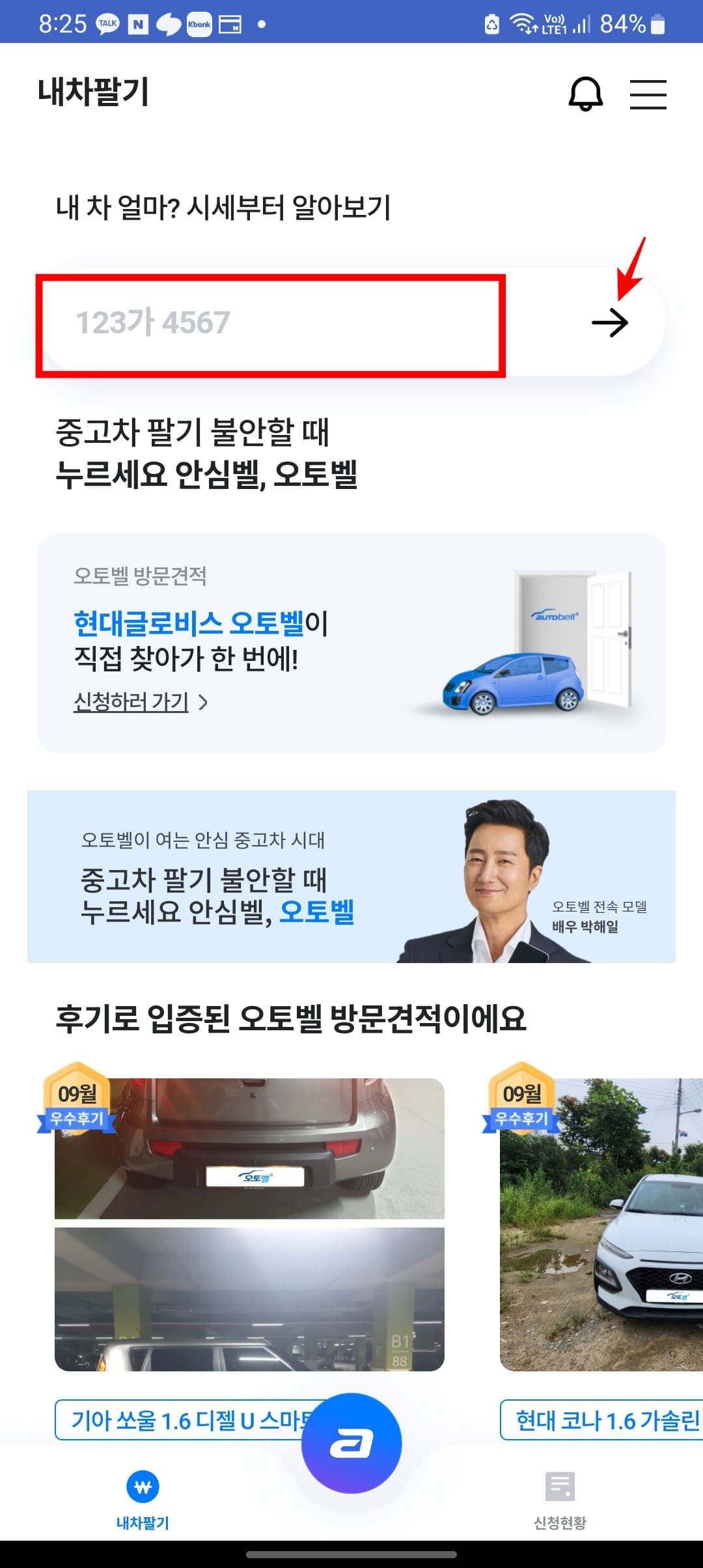 메인 화면에서 '팔고 싶어요' 버튼을 터치합니다. 내차 팔기 화면에서 상단 입력창에 자신의 차량번호를 입력하고 우측의 화살표 버튼을 터치합니다. 결과를 확인하시면 대략적인 차량의 시세를 파악할 수 있습니다. 오토벨은 방문견적 서비스도 제공하고 있습니다. 전문가가 직접 찾아가서 한 번에 견적을 내주는 서비스이므로 더 정확한 견적이 필요할 때 이용하면 도움이 될 것입니다.