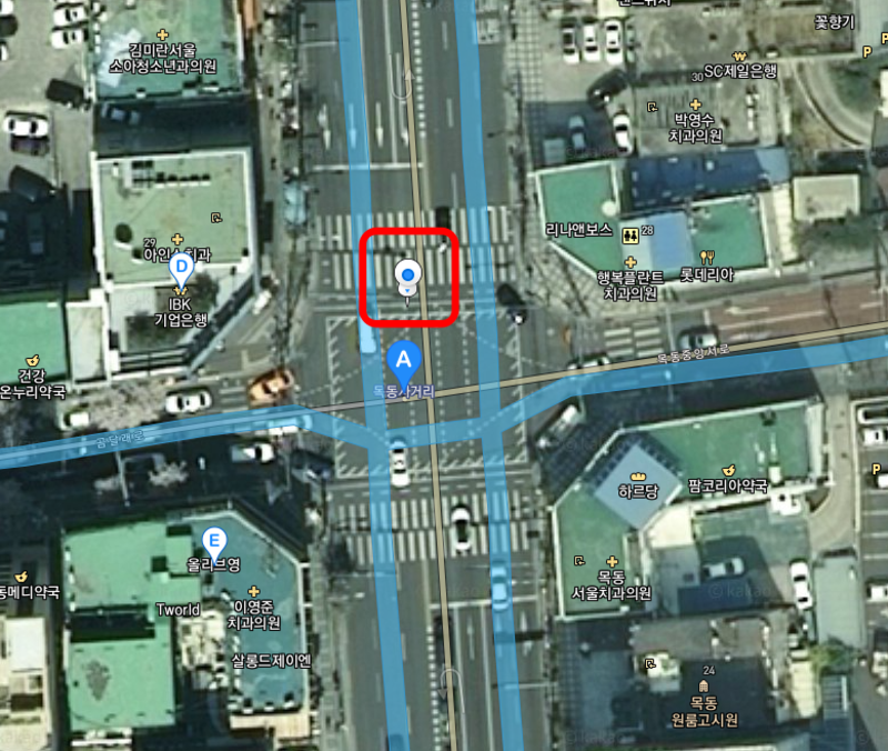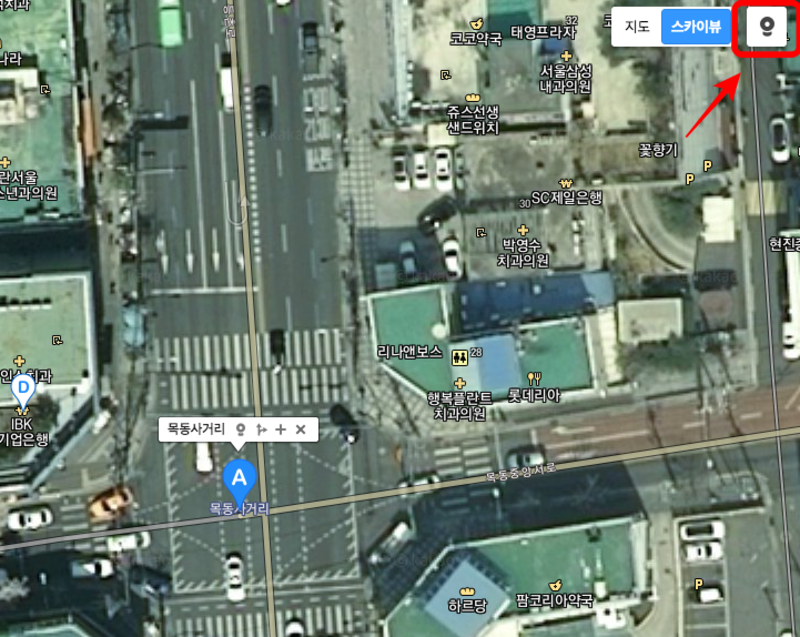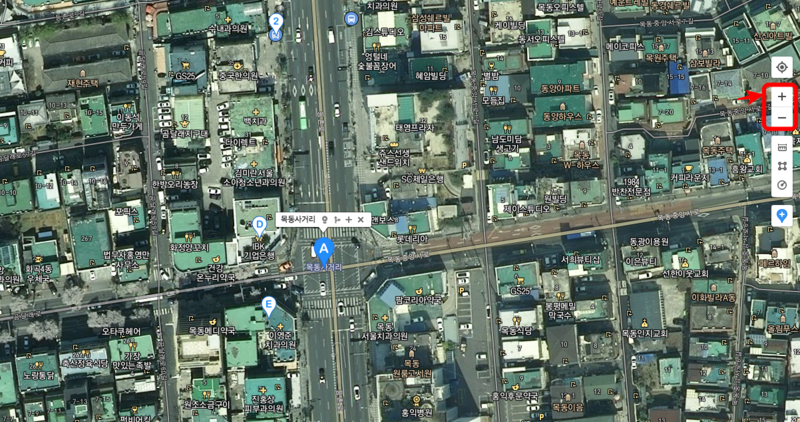 이번에는 다음지도 스카이뷰를 좀 더 상세히 알아보겠습니다. 목동사거리의 상권과 현재 위치한 건물들의 특성을 살펴보기 위해 위성지도를 확대하도록 하겠습니다.