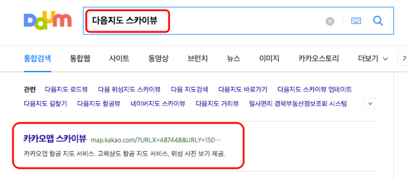 국내 최고해상도의 전국 항공사진을 이용하시려면 먼저 다음 포털 사이트 검색에 아래의 사진처럼 ‘다음지도 스카이뷰’를 검색하고 바로가기를 선택합니다.