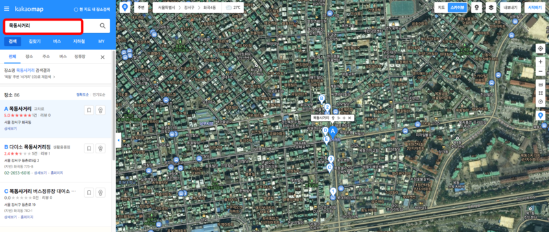 먼저 좌측 메뉴에 찾고자 하는 위치를 입력합니다. 저는 목동사거리를 검색해 보도록 하겠습니다. 입력을 완료하시면 바로 왼쪽에 위성사진을 다음 스카이뷰가 보여주게 됩니다. 원하시는 위치를 검색창에 입력시키면 쉽게 조회가 가능합니다.