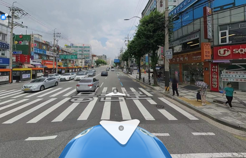 이후 자신이 로드뷰로 보고 싶은 지역에 돋보기 아이콘을 놓고 클릭합니다. 지도상에 파란색으로 표시된 부분이 선택 가능한 영역이며 360도 카메라로 촬영한 지역을 상세히 둘러보실 수 있습니다.