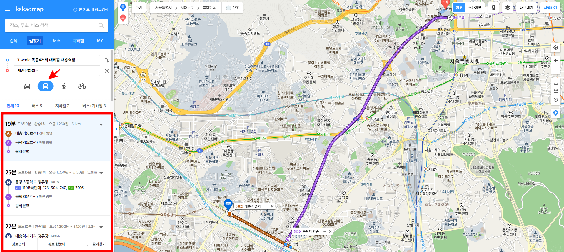 이번에는 다음 빠른길찾기 메뉴에서 대중교통을 선택해보겠습니다. 해당 경로에서 이용할 수 있는 대중교통이 모두 표시됩니다.