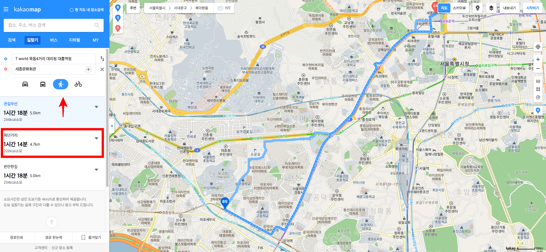 이번에는 도보이동을 선택해 보겠습니다. 출발지부터 도착지까지 갈 수 있는 최단거리가 우측 지도에 표시됩니다. 좌측 메뉴를 확인하시면 이동경로가 큰길 우선, 최단거리, 편안 한길로 세분화됩니다. 가장 빠른 길을 찾으신다면 최단거리를 이용하시면 됩니다.