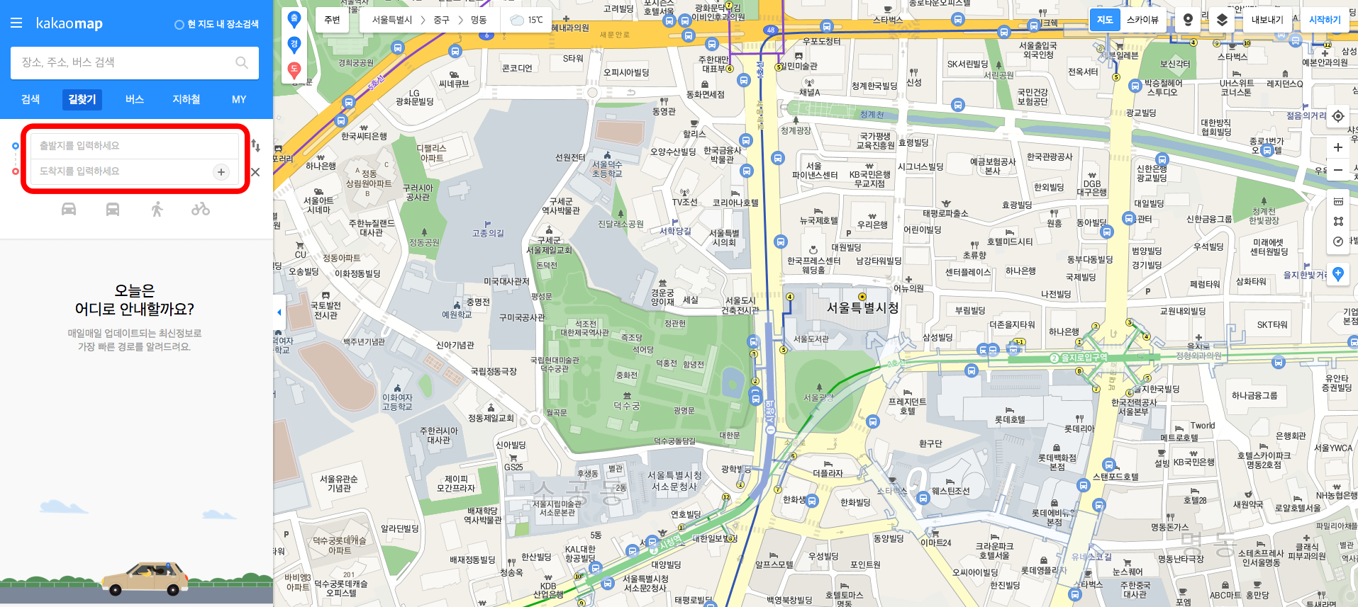 먼저 첫 화면에는 장소나 주소, 버스를 검색할 수 있는 검색창이 좌측에 표시됩니다. 길찾기 메뉴에서 출발지와 도착지를 입력하시면 됩니다. 여기에서는 목동 4거리 근처에서 세종문화회관으로 이동을 해보도록 하겠습니다.