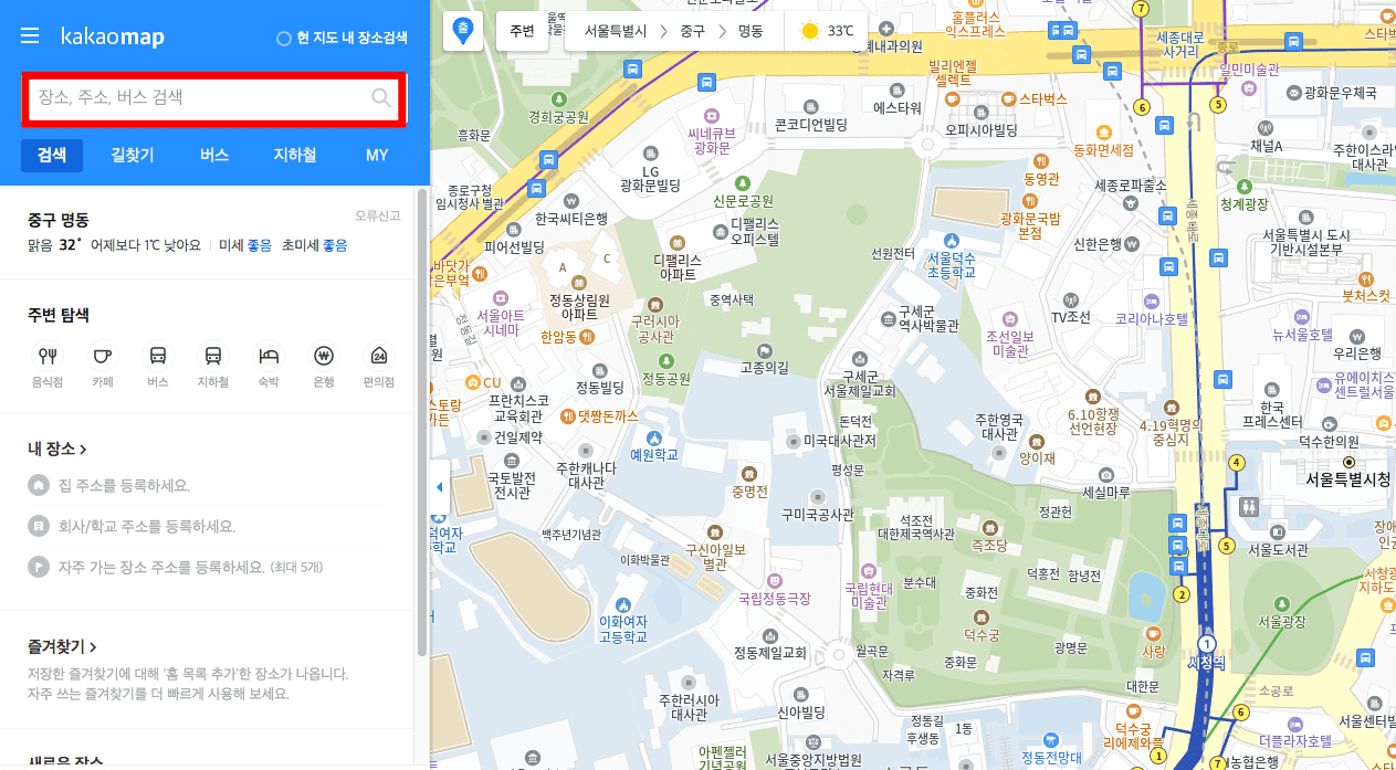 카카오맵에 방문하시면 위와 같은 화면을 보게 됩니다. 좌측 상단 검색창에 [대신택배 영업소]를 입력하고 우측의 돋보기 아이콘을 클릭합니다.