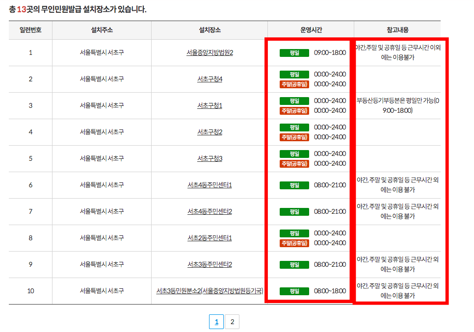 무인민원발급 설치장소 안내 페이지가 표시되면 지역과 위치를 입력하시고 검색 버튼을 클릭합니다. 검색 결과를 확인하시면 서초구에 위치한 무인민원발급기의 설치장소아 운영시간을 확인할 수 있습니다. 운영시간에서 평일과 주말 이용이 가능한지 여부와 야간, 주말, 공휴일에 이용이 가능한지 참고내용도 확인하시기 바랍니다.