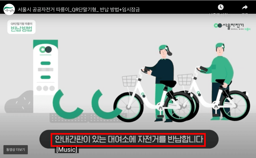 따릉이 반납은 안내간판이 설치되어 있는 따릉이 대여소에서 반납할 수 있습니다. 대여할 때와 마찬가지로 따릉이를 대여소 거치대 위에 올려둡니다.