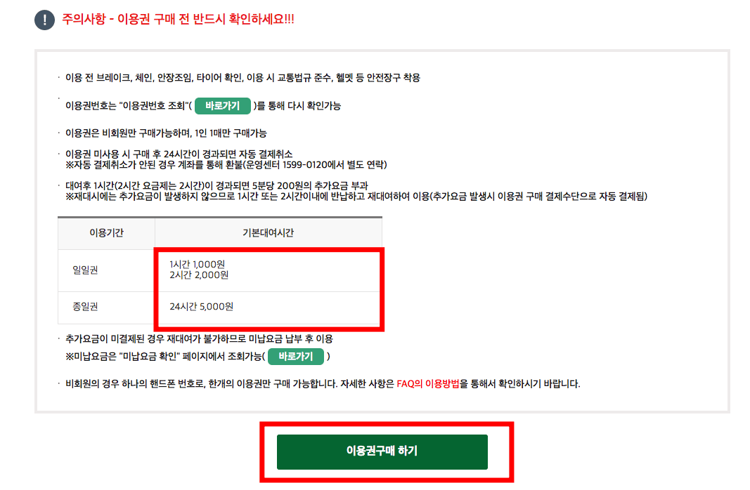 이제 따릉이 대여소를 찾아가면 대여소에서 위와 같은 모양의 따릉이를 찾아볼 수 있습니다. 단말기는 뒷바퀴 상단부에 있으며 이용권이 필요하니 구매해 보도록 하겠습니다. 따릉이 홈페이지 또는 따릉이 앱의 이용권구매 메뉴를 선택합니다. 비회원의 경우 일일권은 1시간에 1천 원이며 종일권은 24시간에 5000원입니다. 하단의 [이용권 구매하기] 버튼을 클릭합니다.