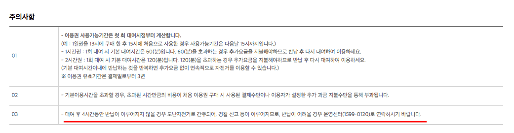 이는 주행자의 안전을 위한 주의사항이므로 꼭 지켜주시기 바랍니다. 마지막으로 따릉이를 대여한 후 4시간동안 반납이 이루어지지 않는 경우 도난된 자전거로 간주되어 경찰에 신고가 될 수 있으므로 부득이한 상황이 발생하는 경우 따릉이 운영센터 (1599-0120)으로 꼭 연락하시기 바랍니다.