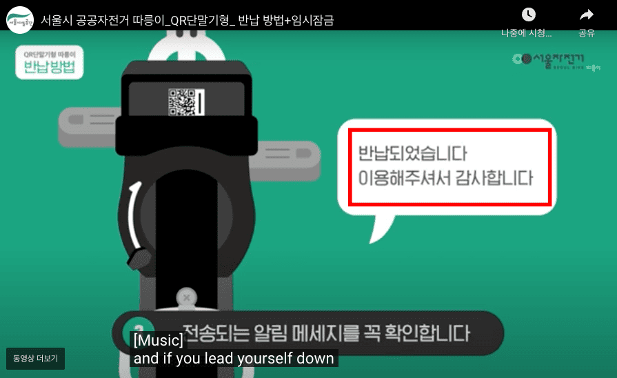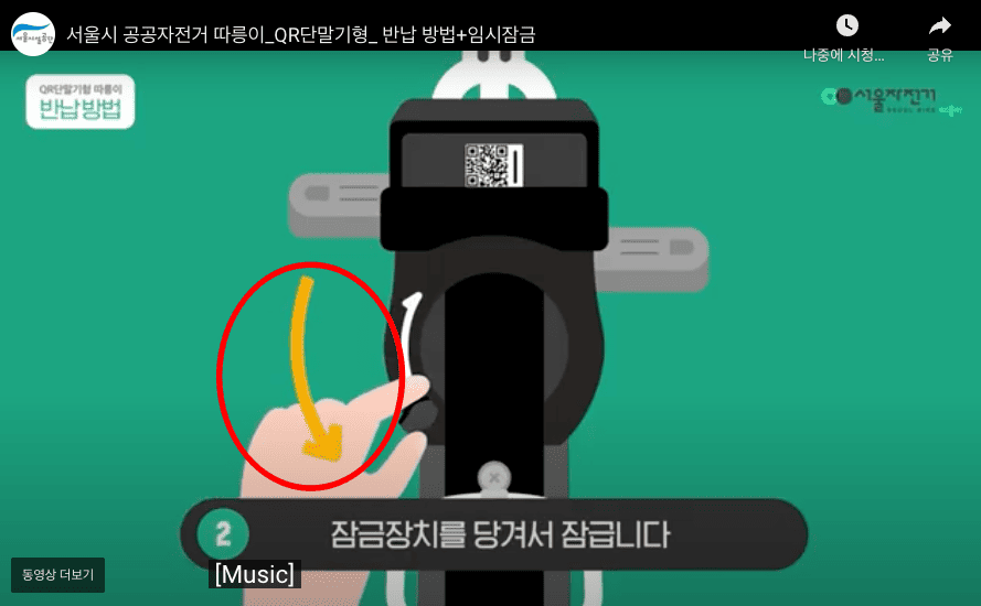 이후 장금장치를 아래쪽으로 당겨서 잠급니다. 이후 ‘반납되었습니다. 이용해 주셔서 감사합니다’라는 알림 메시지가 들리는 것을 확인하면 반납이 완료된 것입니다.