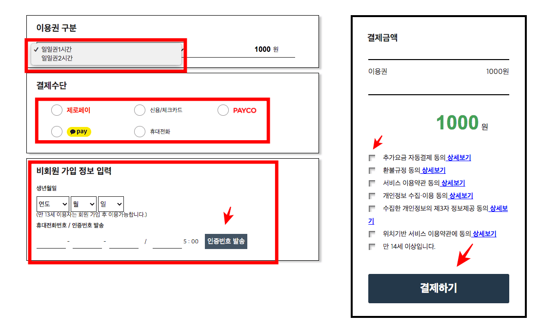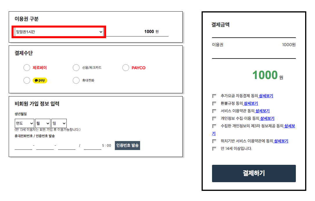 비회원의 경우 이용권은 1회 1매씩 구매가 가능하며 대여시간 초과시 5분마다 추가요금 200원이 부과되니 참고하시기 바랍니다. 하단에서 이용권 구분을 선택하여 일일권 1시간 또는 2시간을 선택합니다. 결제수단과 비회원가입 정보를 입력하시고 인증번호 발송을 선택하여 인증을 받습니다. 이후 우측의 모든 동의를 확인하시고 체크한 후 하단의 결제하기 버튼을 클릭하면 결제가 완료됩니다.