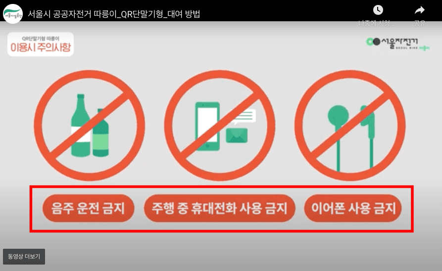 따릉이 사용법을 숙지하셨더라도 꼭 지켜야 할 안전수칙이 있습니다. 가장 중요한 것은 따릉이로 주행하기 전 자전거 자체에 결함이 있는지 확인해야 합니다. 타이어와 브레이크 그리고 체인을 모두 확인하고 이상이 없으면 주행하시기 바랍니다. 또한 따릉이를 탈 때 음주 후 타거나 주행 중 휴대전화를 사용하거나 이어폰을 사용해서는 안됩니다.