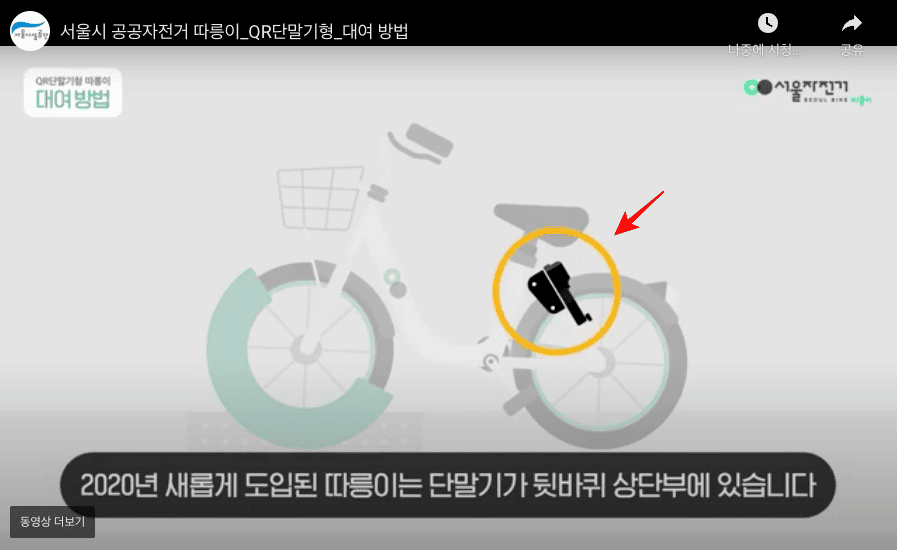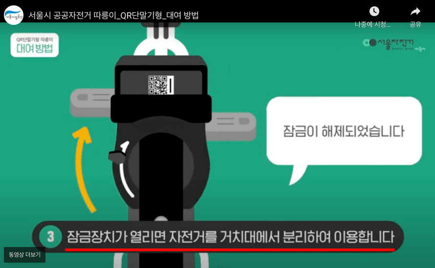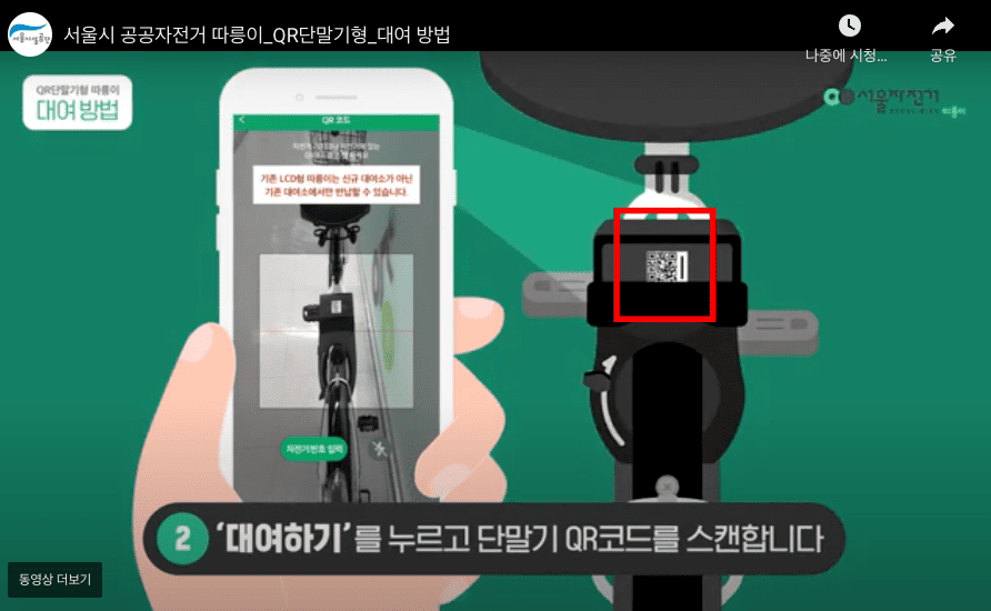 이제 따릉이 앱에서 대여하기 메뉴를 선택하고 단말기의 QR코드를 스캔합니다. 잠겨진 장치를 위쪽으로 열리면 따릉이를 거치대에서 분리하여 사용하시면 되니 직접 시도해 보시기 바랍니다.