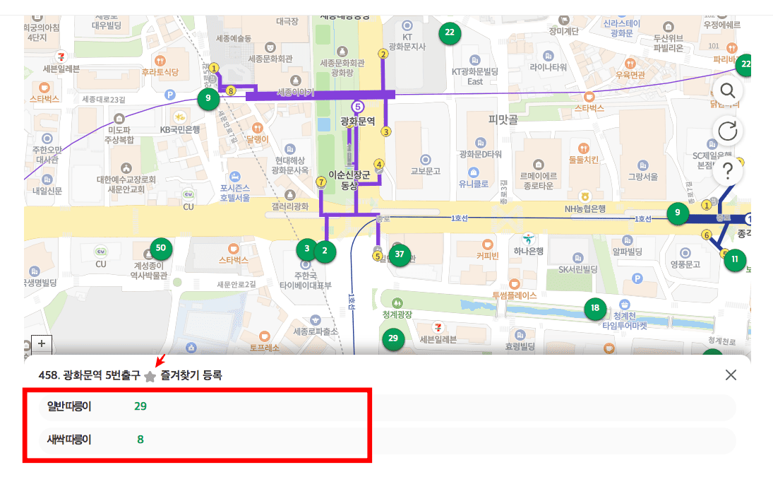지도 위에 초록색 동그라미로 표시된 곳이 따릉이 대여 및 반납이 이루어지는 곳입니다. 마우스로 클릭해 보면 하단에 정확한 위치와 따릉이의 대여 가능 숫자가 표시되니 자주 이용하는 곳이라면 상단 즐겨찾기 등록을 클릭하여 등록해 둡니다.