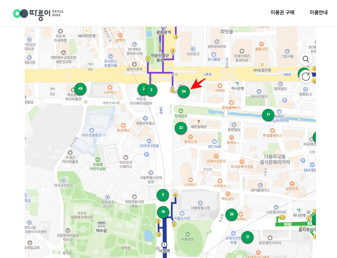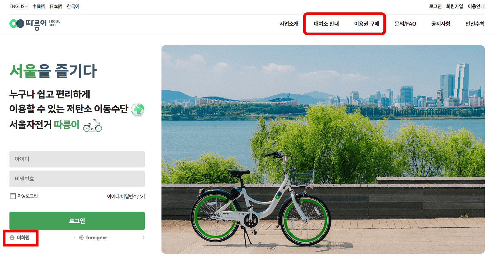 따릉이 홈페이지에 도착하시면 위와 같은 메인 화면을 볼 수 있습니다. 따릉이는 회원가입 시 정회원으로 정기권 이용이 가능하며 비회원인 경우 일일권만 이용이 가능합니다. 먼저 인근 대여소를 찾아보시려면 상단 메뉴의 [대여소 안내]를 선택합니다.