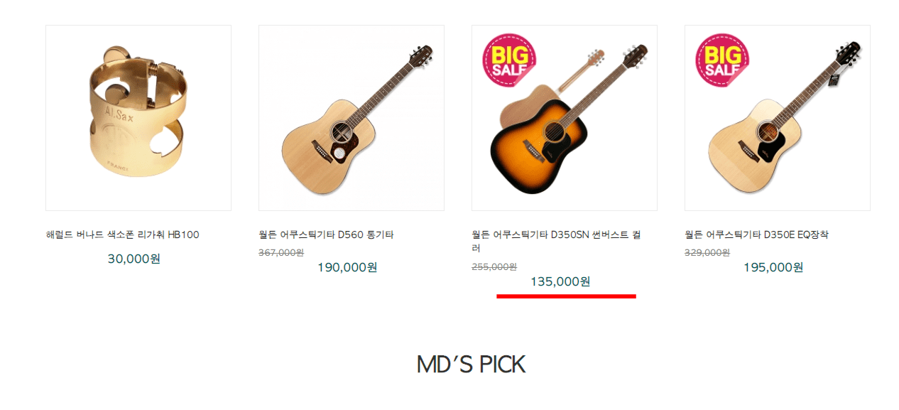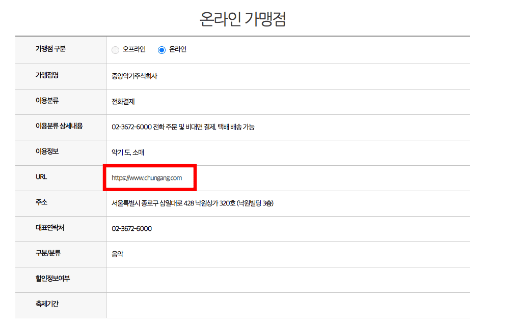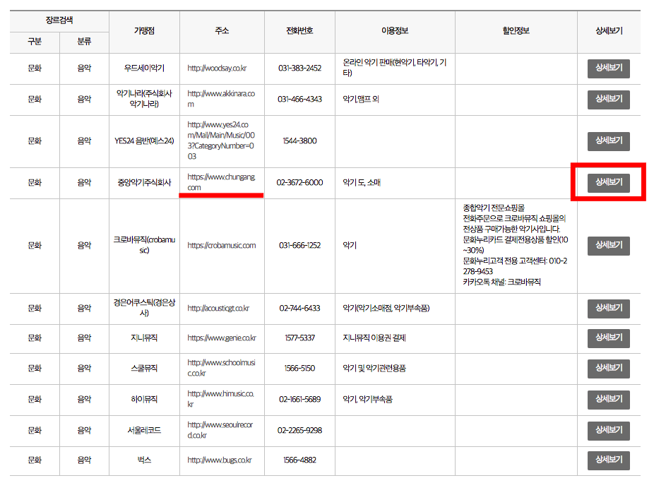 문화누리카드 온라인 사용처 검색결과를 살펴보시면 가맹점 이름과 웹사이트 주소, 전화번호, 이용정보 등이 표시됩니다. 만약 악기를 구매하고 싶으시다면 우측의 상세보기 버튼을 선택합니다. 온라인 가맹점 정보가 화면에 표시되면 URL을 클릭하여 해당 온라인 쇼핑몰에 방문해 봅니다. 할인을 통해 저렴하게 판매하고 있는 악기를 찾아볼 수 있었습니다.