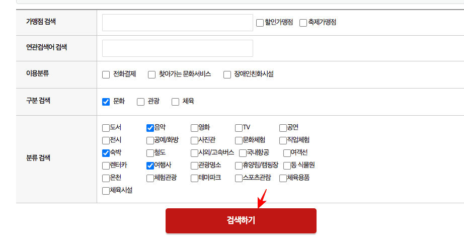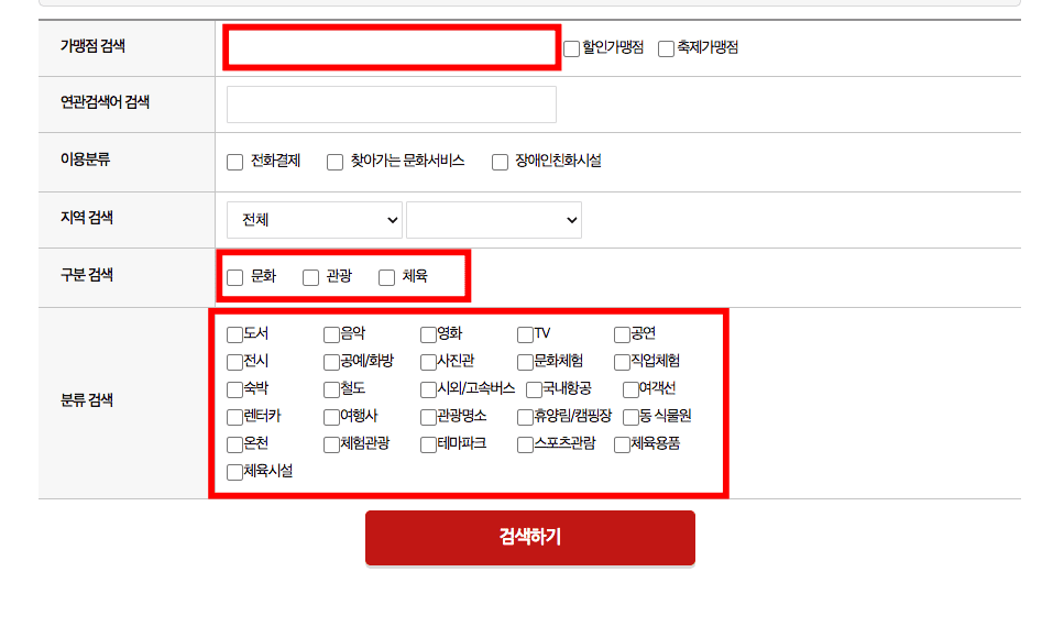 문화누리카드 사용처를 온라인 가맹점으로 조회하려면 좌측 메뉴 오프라인 가맹점 하단의 [온라인 가맹점]을 선택합니다. 검색 메뉴가 표시되면 가맹점 이름이나 연관검색어, 또는 구분 및 분류검색에서 필요한 서비스를 체크하시기 바랍니다. 온라인에서 이용할 수 있는 서비스는 도서, 전시, 숙박, 영화, 음악, 철도, 테마파크, 스포츠관람 등 온프라인과 같으며 모든 체크가 완료되었으면 하단의 [검색하기] 버튼을 클릭합니다.