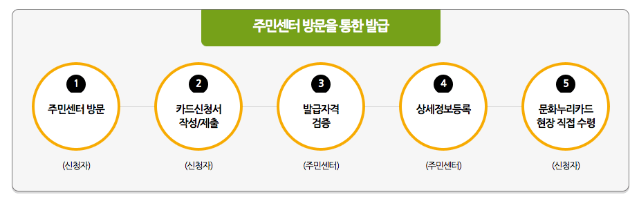 주민센터에 신분증을 지참하셔서 방문하시면 문화누리카드 신청서를 찾아볼 수 있습니다. 신청서를 작성하여 제출하시면 주민센터의 발급자격 검증을 통해 상세정보가 등록이 되며 문화누리카드를 주민센터 현장에서 직접 수령할 수 있습니다.