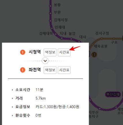 이번에는 부산 지하철 1호선 시청역에서 좌천까지 구간의 시간표 정보를 알아보겠습니다. 노선도에서 시청역을 선택하고 이후 좌천역을 선택합니다. 조회 결과가 표시되면 좌측에서 시간표 메뉴를 찾을 수 있습니다.